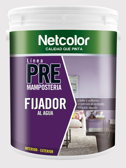 Fijador Interior Exterior al Agua NetColor PRE es un concentrado acrílico que sella los poros, fija la superficie y uniforma la absorción de la misma mejorando la terminación y reduciendo el consumo de acabado.